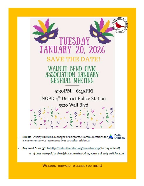 Join us on Tuesday, January 20, at 5:30pm at the NOPD 4th District Station, 3320 Wall Blvd.